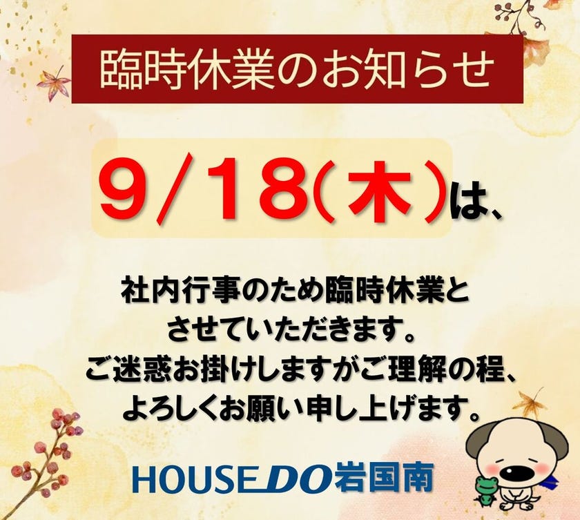 【臨時休業のお知らせ】 ハウスドゥ岩国南です。 誠に勝手ながら9月18日(木)は社内行事のため臨時休業とさせていただきます。 ご不便をおかけいたしますがご理解のほどよろしくお願いいたします。 なお、翌日からは通常営業いたします。 今後ともどうぞよろしくお願いします。