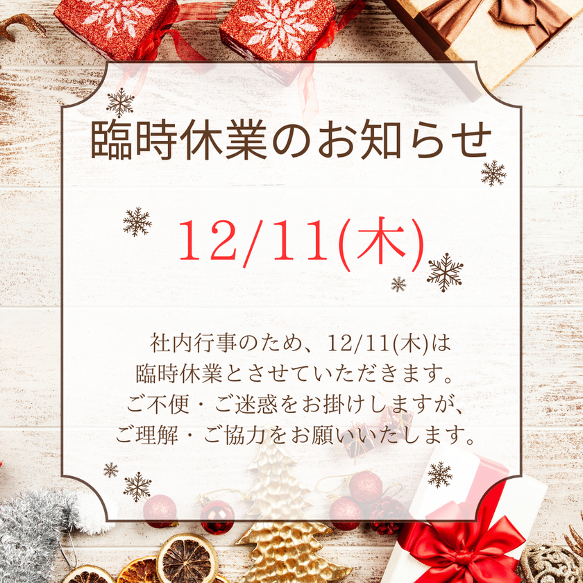 誠に勝手ながら12月11日(木)は社内行事のため臨時休業とさせていただきます。