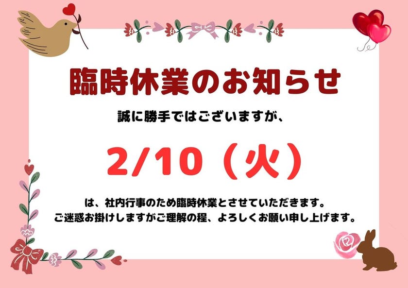 誠に勝手ながら、2月10日(火)は社内行事のため臨時休業とさせていただきます。 臨時休業中にいただいたお問い合わせにつきましては、2/12(木)より順次対応いたします。 お客様にはご不便をおかけいたしますが、何卒ご理解のほどお願い申し上げます。
