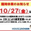ハウスドゥ岩国南店です。 誠に勝手ではございますが、10月27日(金)は社内研修のため、臨時休業とさせていただきます。 ご不便とご迷惑お掛けいたしますが、ご理解とご協力賜りますようお願い申...