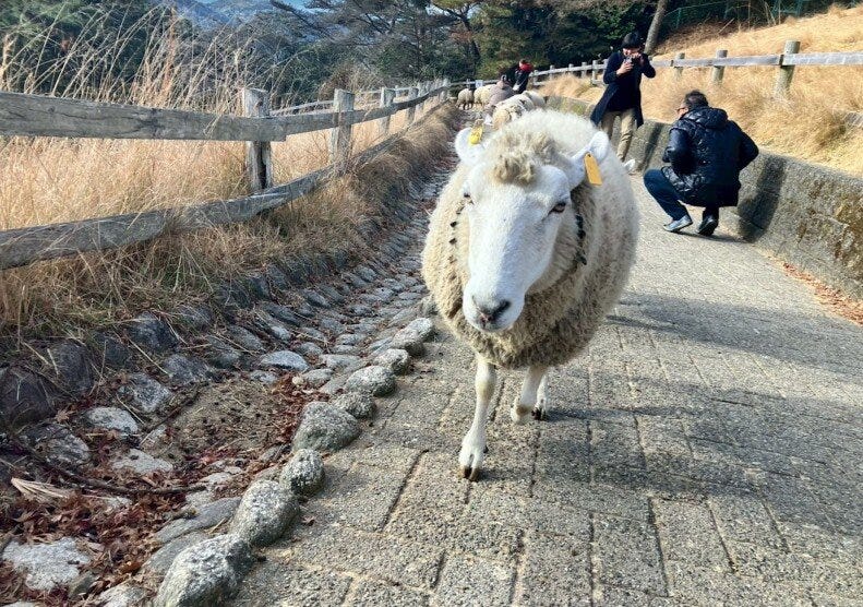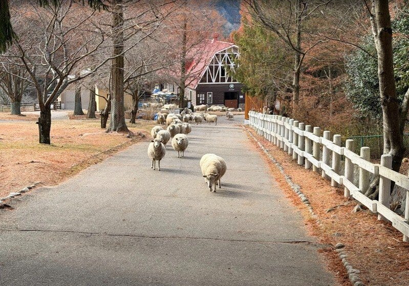 羊あらわる。放し飼い。そういうことか。注意書きいるわ確かに。