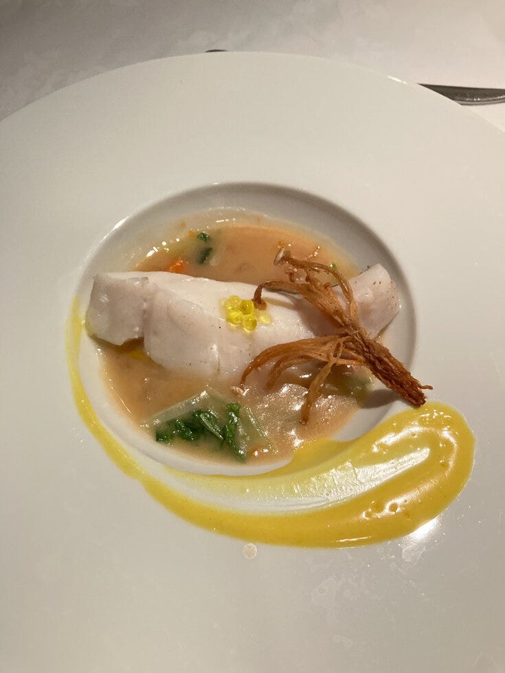 北海道産真鱈のオーブン焼き 魚介とカブのブルーテ 榎のフリット