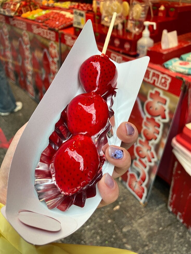 ゴマ団子をつつきながらいちご飴!