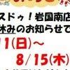 こんにちは。ハウスドゥ!岩国南店の藤木です。 当店は明日8/11(日)より8/15(木)までお盆休みとなります。 ご来店の際はご注意ください。