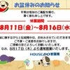 こんにちは。ハウスドゥ岩国南店です。 誠に勝手ではございますが、8月11日(金)~8月16日(水)は夏季休業とさせていただきます。 ご不便とご迷惑お掛けいたしますが、ご理解とご協力賜ります...